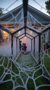 You’ll need sturdy attachment points and weather-resistant webbing for this one. The effect is absolutely worth it though – imagine trick-or-treaters walking under a massive web tunnel!