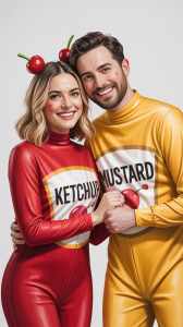 For Both: You’ll need red and yellow clothing (or full body suits if you’re really committed). Add the ketchup and mustard labels, and you’ve got an instant conversation starter.